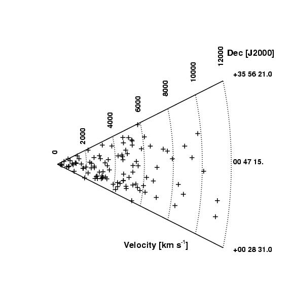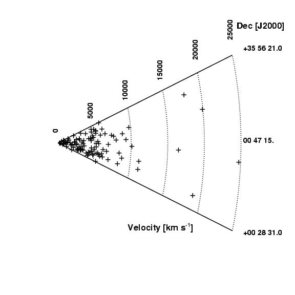 Sky distribution of the observed galaxies, in Declination and velocity space.