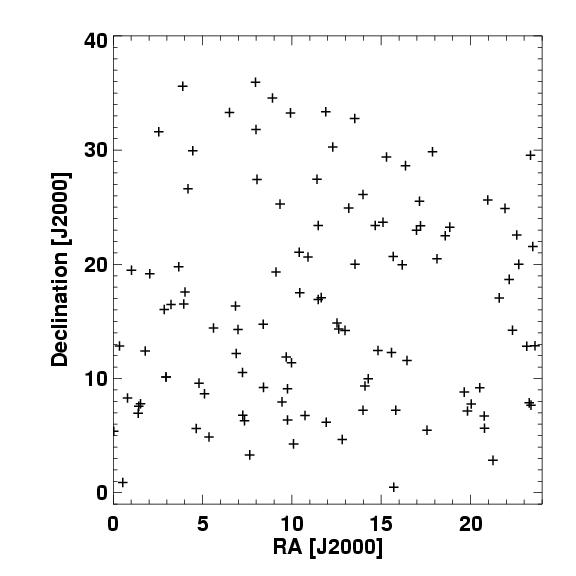 Sky distribution of the observed galaxies, in Right Ascension and Declination.