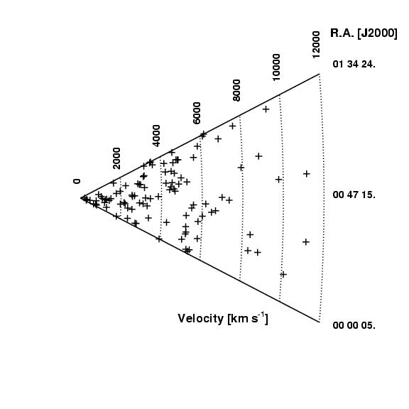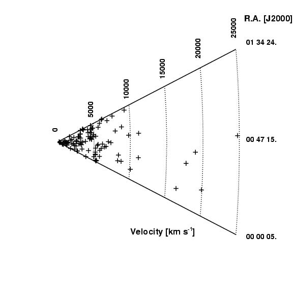Sky distribution of the observed galaxies, in Right Ascension and velocity space.