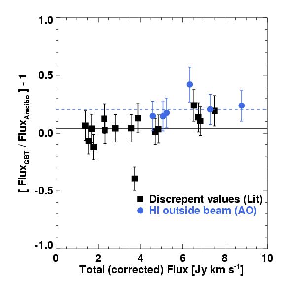 Comparison between the fluxes found with the Arecibo and Green Bank Telescopes. the same is broken into three groups - objects which we beleive our Arecibo measurements to be correct (black), objects which we beleive the flux extends well beyond the Arecibo beam (red), and object which are confused in the Green Bank beam (blue).