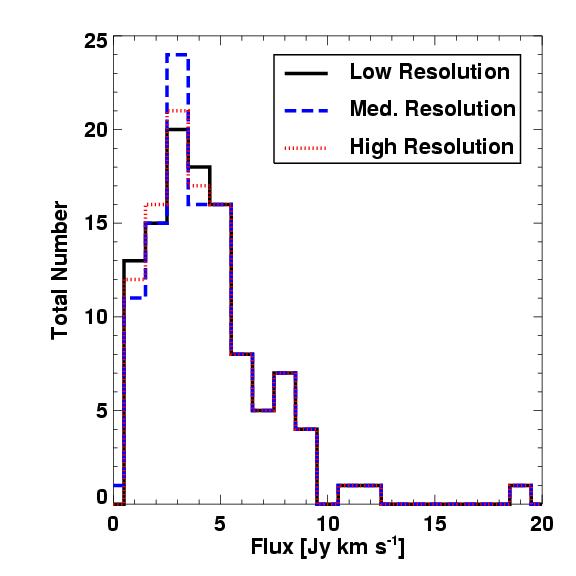 the 1.3 km/s resolution data, and the dotted red line is the 0.65 km/s resolution data.
